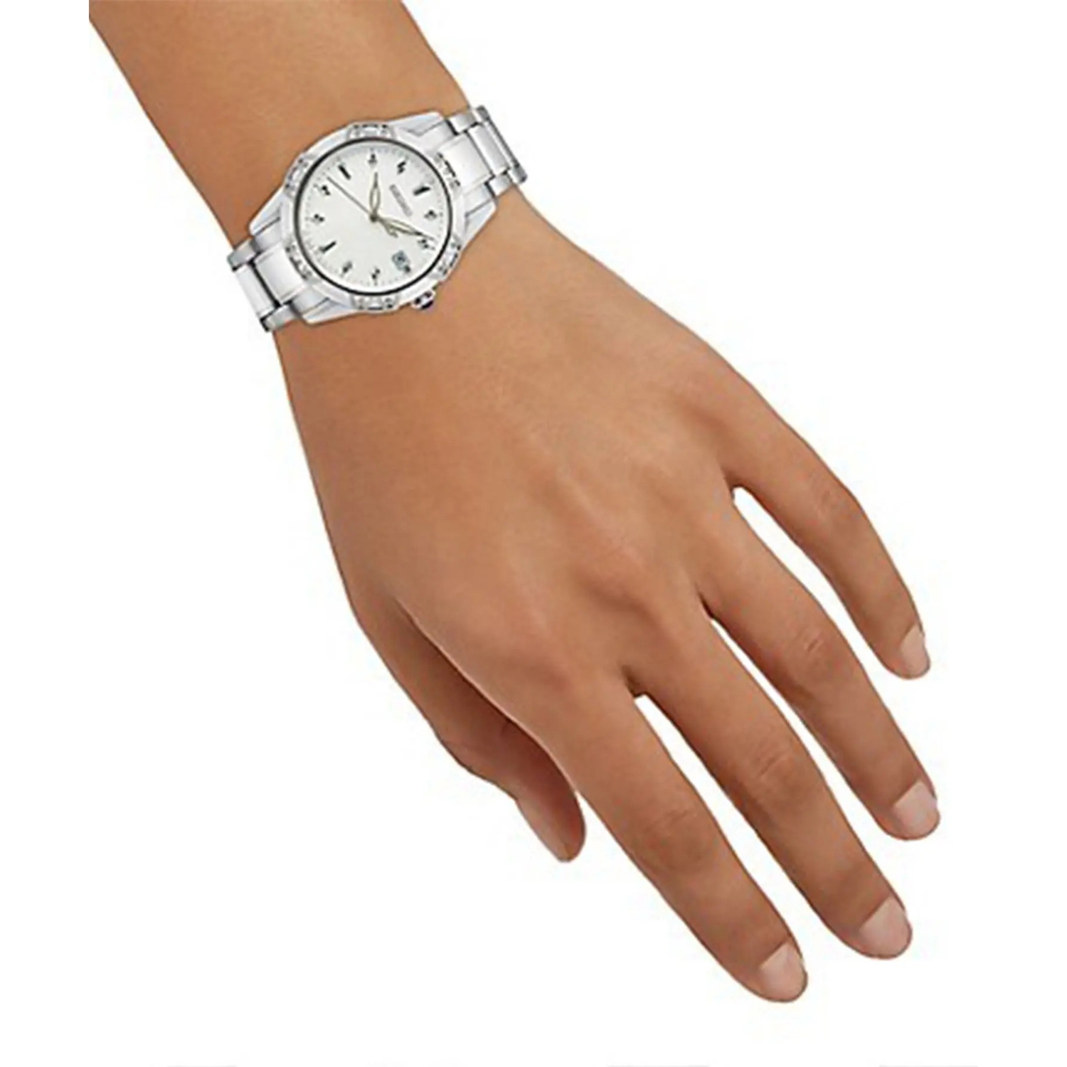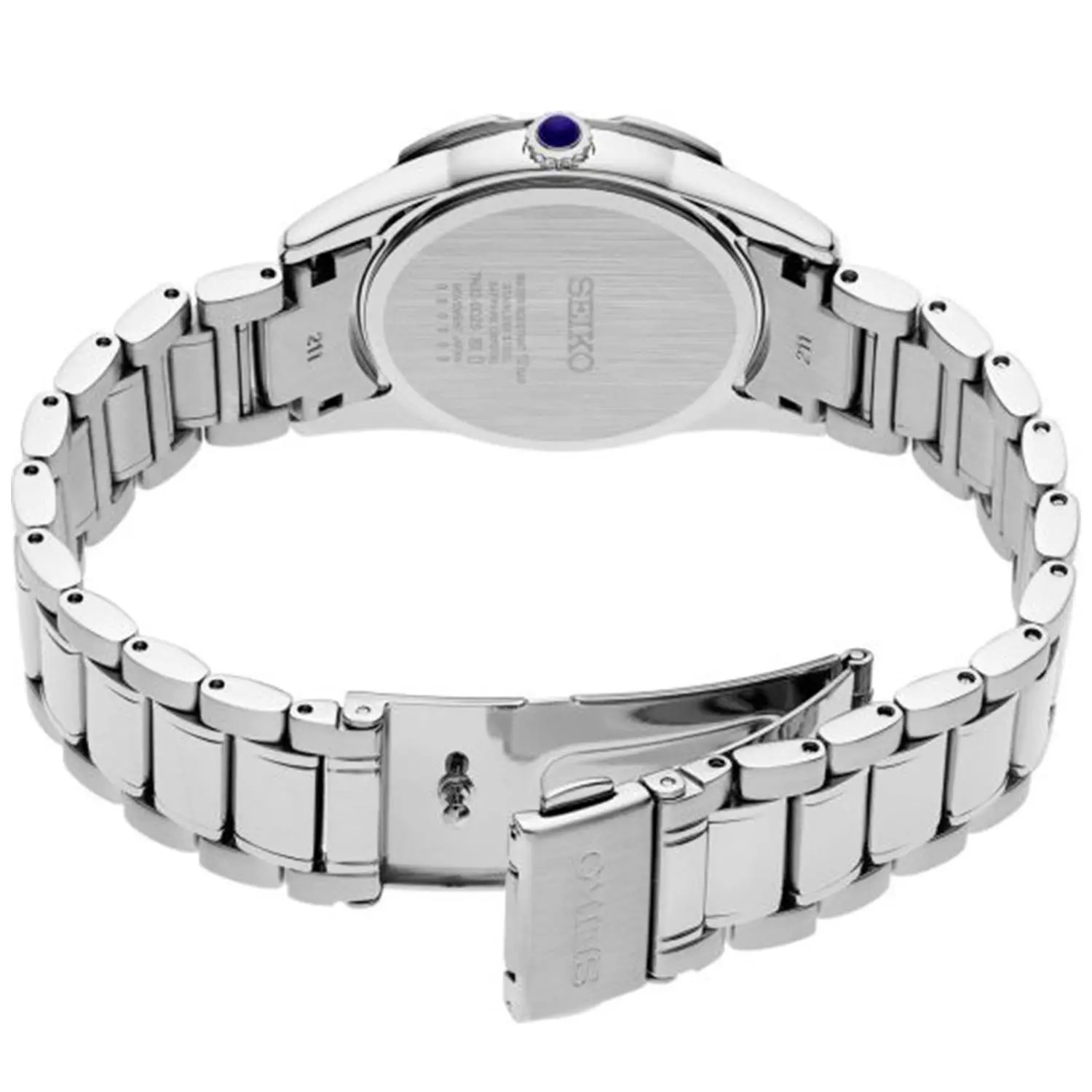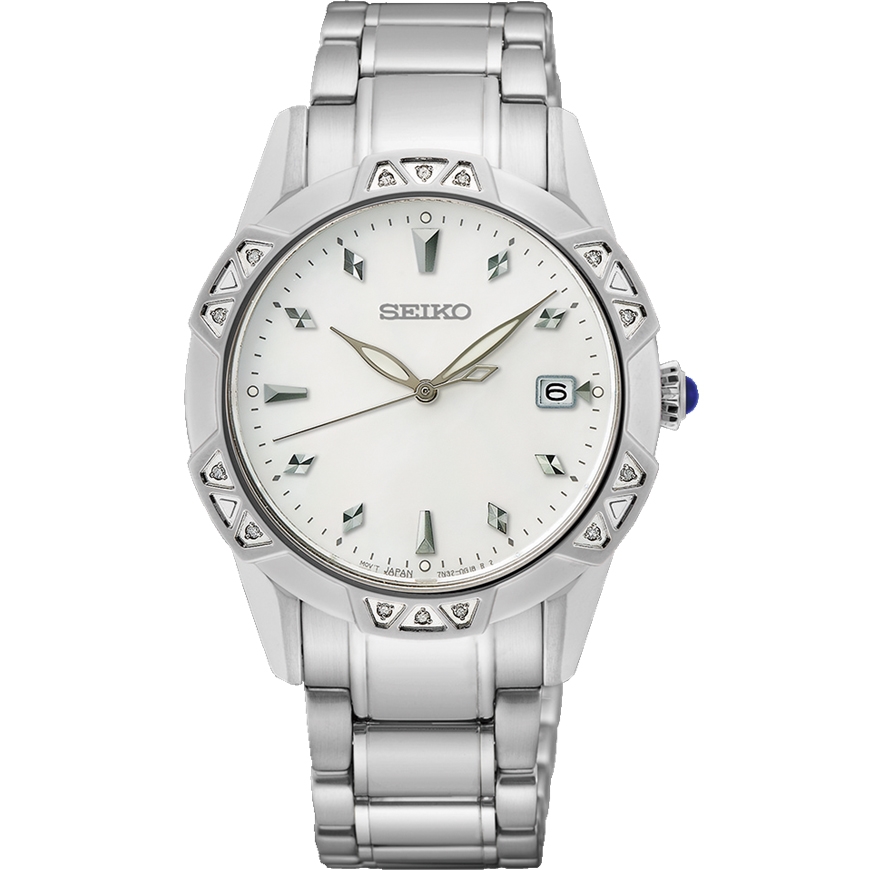 ساعت مچی زنانه سیکو seiko با طراحی کلاسیک بند استیل و قاب گرد نگین دار و صفحه سفید با شیشه ضد خراش و قابلیت داشتن تقویم شب نما و موتور ژاپنی با انرژی باتری و مقاومت در برابر اب تا عمق 100 متر به همراه دو سال گارانتی بین المللی
