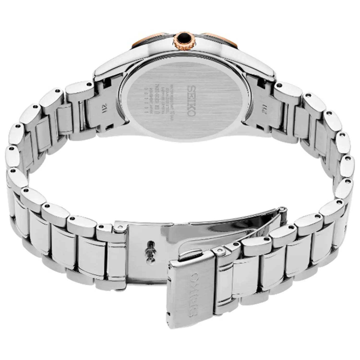 ساعت مچی زنانه سیکو seiko با طراحی کلاسیک بند استیل و قاب گرد نگین دار دو رنگ و صفحه دو رنگ با شیشه ضد خراش و قابلیت داشتن تقویم شب نما و موتور ژاپنی با انرژی باتری و مقاومت در برابر اب تا عمق 100 متر به همراه دو سال گارانتی بین المللی