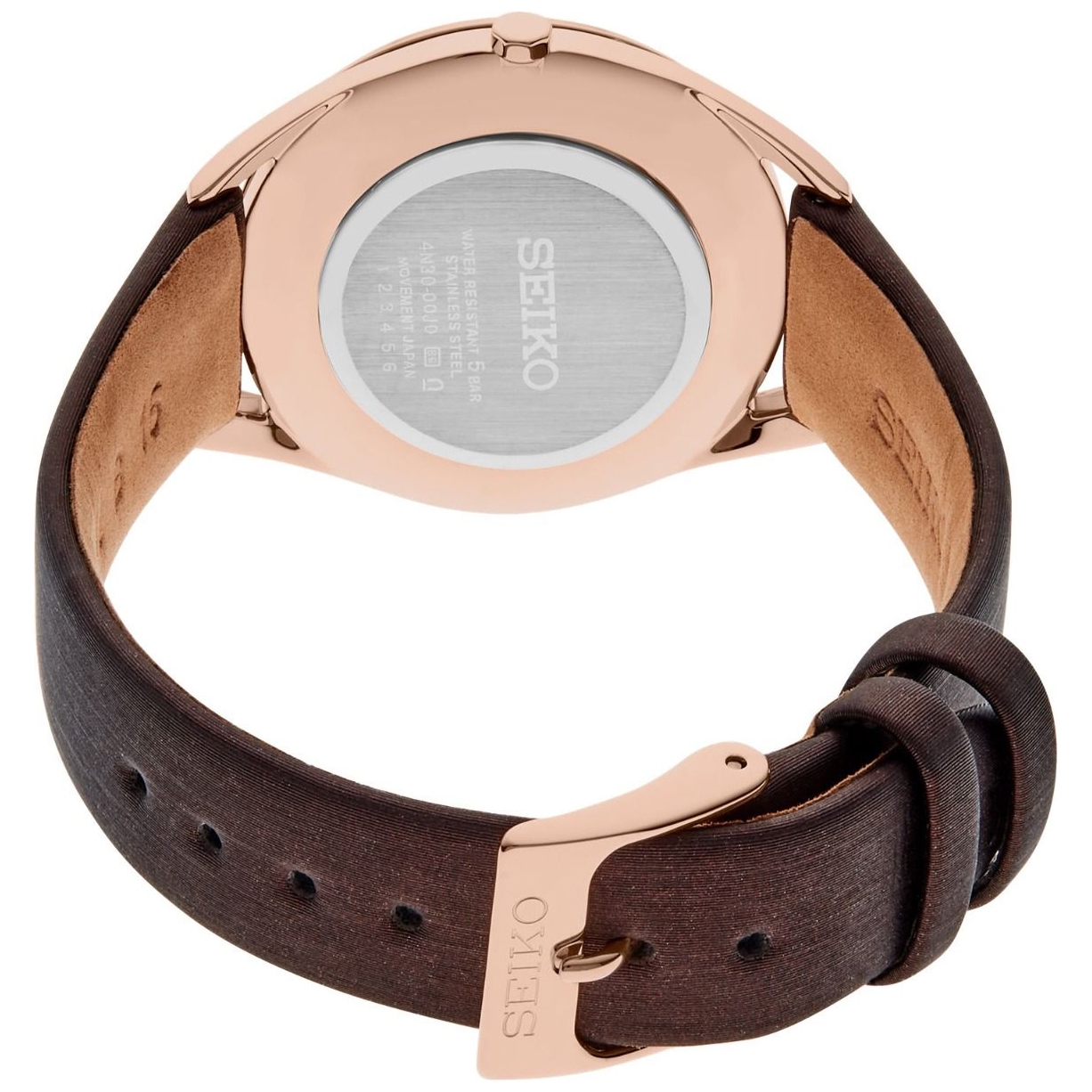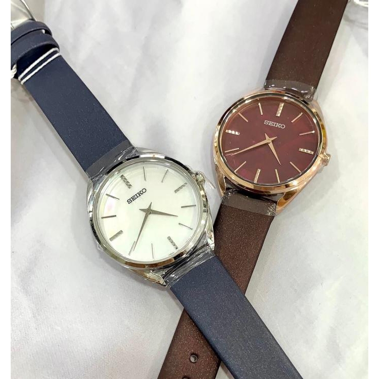 ساعت مچی زنانه سیکو seiko با طراحی ساده بند چرمی و قاب گرد رزگلد و صفحه ارغوانی با موتور ژاپنی و انرژی باتری و مقاومت در برابر اب تا عمق 50 متر به همراه دو سال گارانتی بین المللی