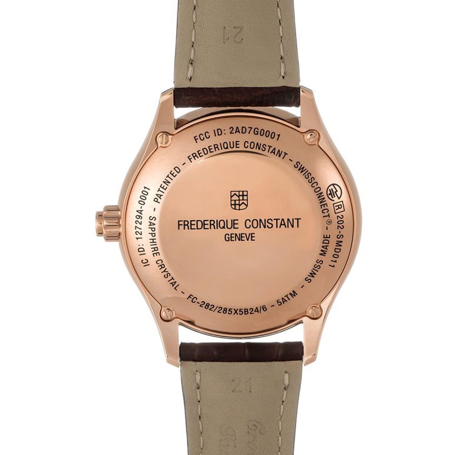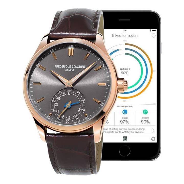 ساعت مچی مردانه فردریک کنستانت FREDERIQUE CONSTANT با طراحی روزانه بند چرم قهوه ای مجهز به قفل کلیپسی با قاب گرد رزگلد و صفحه طوسی با شیشه ضئد خراش و موتور سوییسی با کاربرد اتصال به تلفن همراه توسط بلوتوث و قابلیت تقویم,زمان دوم,کنترل خواب,ردیاب گوشی,میزان مصرف کالری بدن,کنترل پخش موسیقی و تنظیم خودکار زمان به محض اتصال به گوشی با پشتیبانی از نسخت اندروید و آی ا اس با انرژی باطری و مقاوم در برابر آب تا عمق 50 متر به همراه دو سال گارانتی بین المللی شرکت بازرگانی زمردیان